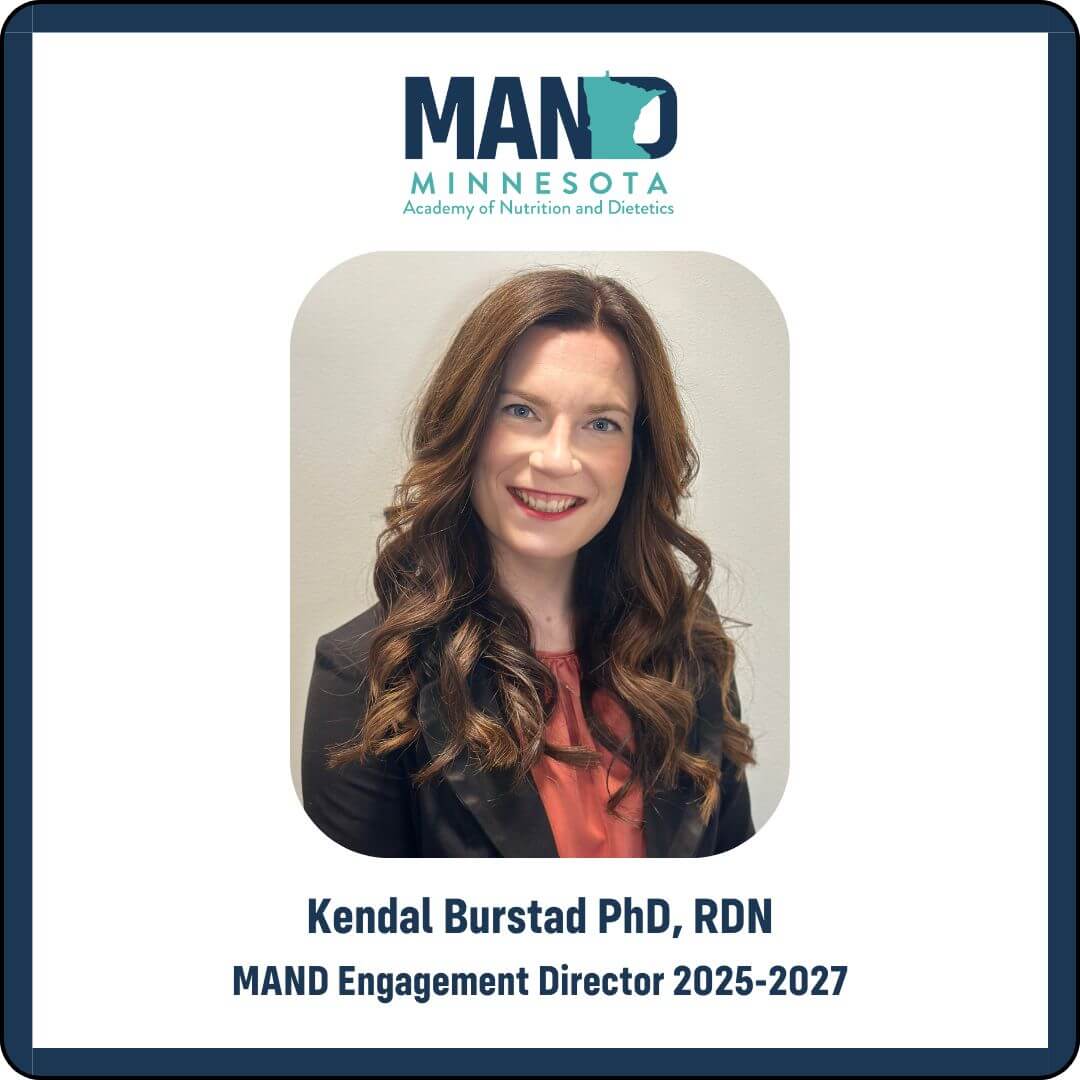 Kendal Burstad, PhD, RDN, is the new Engagement Director with MAND and is eager to connect with nutrition professionals. She has clinical experience in oncology, food allergies, and medical nutrition therapy, and earned her PhD from the University of Minnesota in 2023. Kendal now works as a Medical Science Liaison in the area of nephrology, where a major part of her role is to build relationships with healthcare providers.