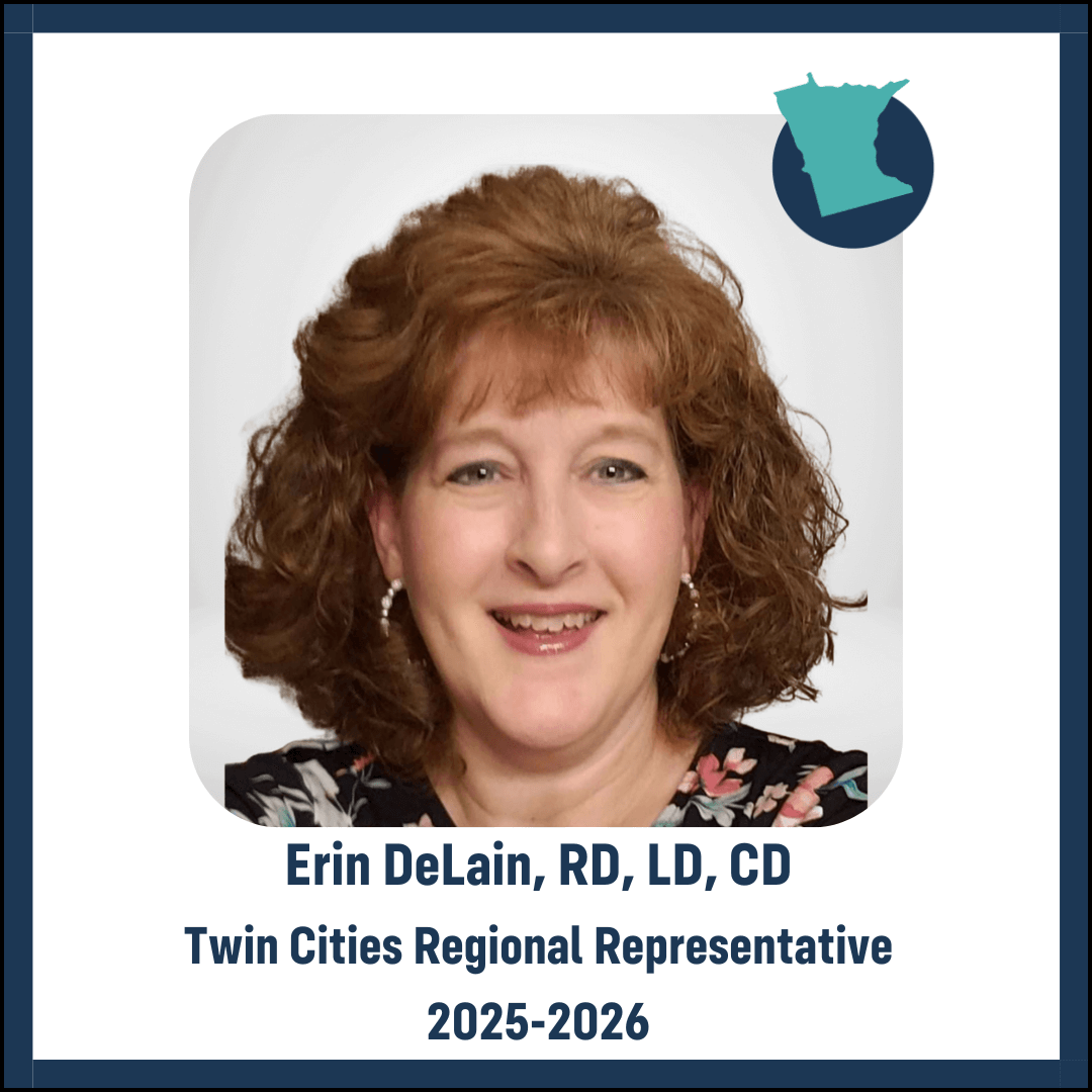 Erin DeLain, RDN, LD, CD is your representative for the Twin Cities Area Region. Erin has been involved with the MAND organization for the past 2 years and brings a background in long-term care, culinary management, and corporate RD management. She is especially focused on RD engagement and recruiting young students to the field of dietetics.